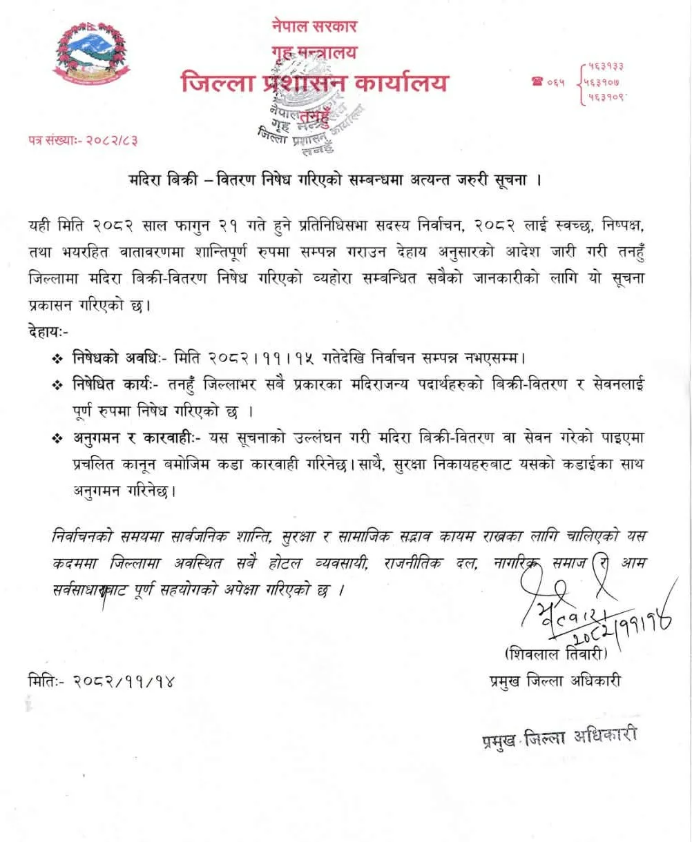 यही २०८२ साल फागुन २१ गते हुने प्रतिनिधिसभा सदस्य निर्वाचनलाई स्वच्छ, निष्पक्ष, तथा भयरहित वातावरणमा शान्तिपूर्ण रुपमा सम्पन्न गराउनको लागि तनहुँ जिल्लाभर मदिराको विक्री, वितरण र सेवनलाई पुर्णरुपमा निषेध गरिएको प्रमुख जिल्ला अधिकारी शिवलाल तिवारीद्वारा जारी सुचनामा जनाईएको छ ।