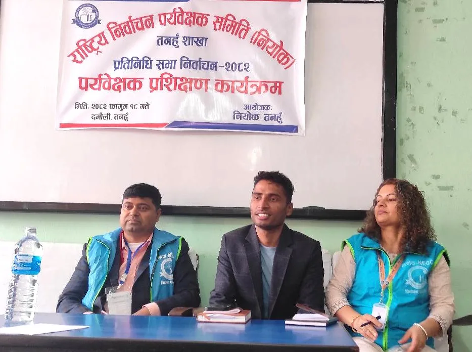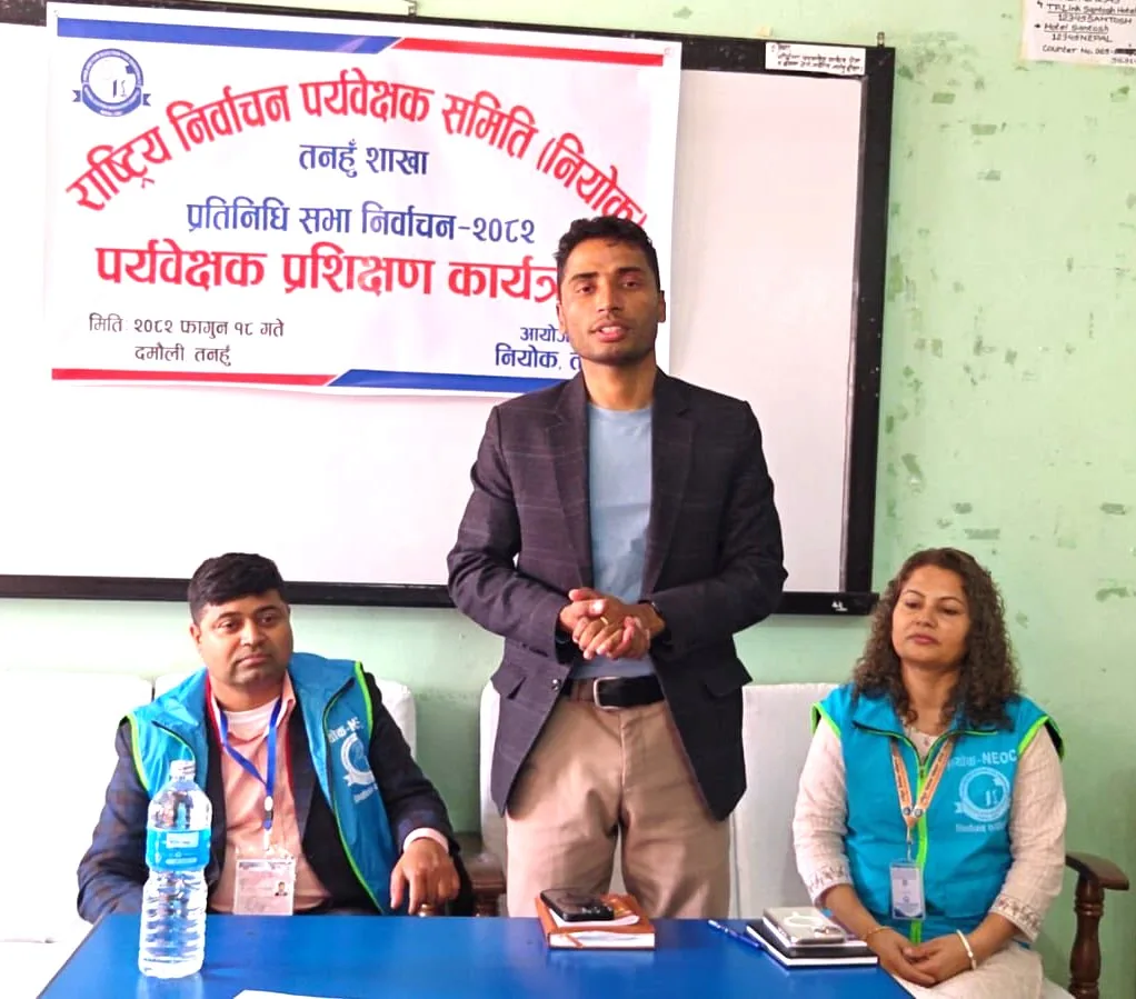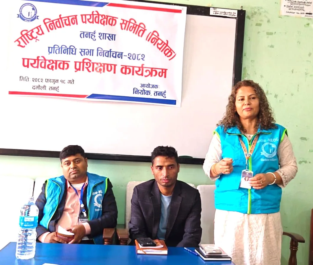राष्ट्रिय निर्वाचन पर्यवेक्षण समिति (नियोक) जिल्ला शाखा तनहुँको आयोजनामा आगामी प्रतिनिधि सभाको निर्वाचनको लागि खटिएका पर्यवेक्षकहरुकोलागि सोमबार दमौलीमा प्रशिक्षण कार्यक्रम सम्पन्न भएको छ । उक्त तालिमको जिल्ला निर्वाचन कार्यालय तनहुँका जिल्ला निर्वाचन अधिकारी विकास लम्सालले उद्घाटन गरे ।