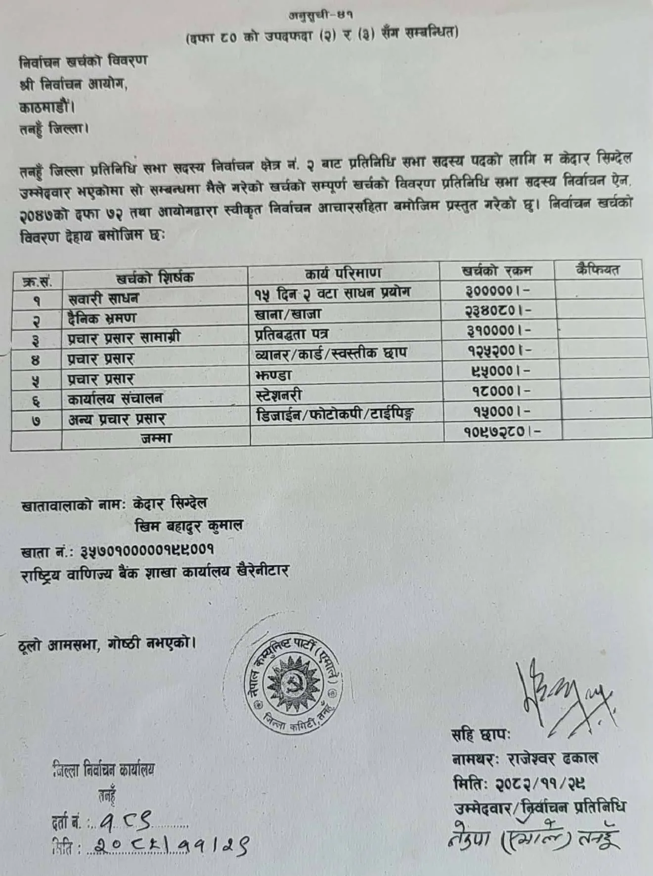 तनहुँ क्षेत्र नम्बर २ का नेकपा एमालेका उम्मेदवार केदार सिग्देलले आफ्नो चुनाबी खर्च विवरण सार्वजानिक गरेका छन् । सिग्देलले शुक्रबार जिल्ला निर्वाचन कार्यालयमा चुनावको आम्दानी र खर्च विवरण बुझाएका छन् ।