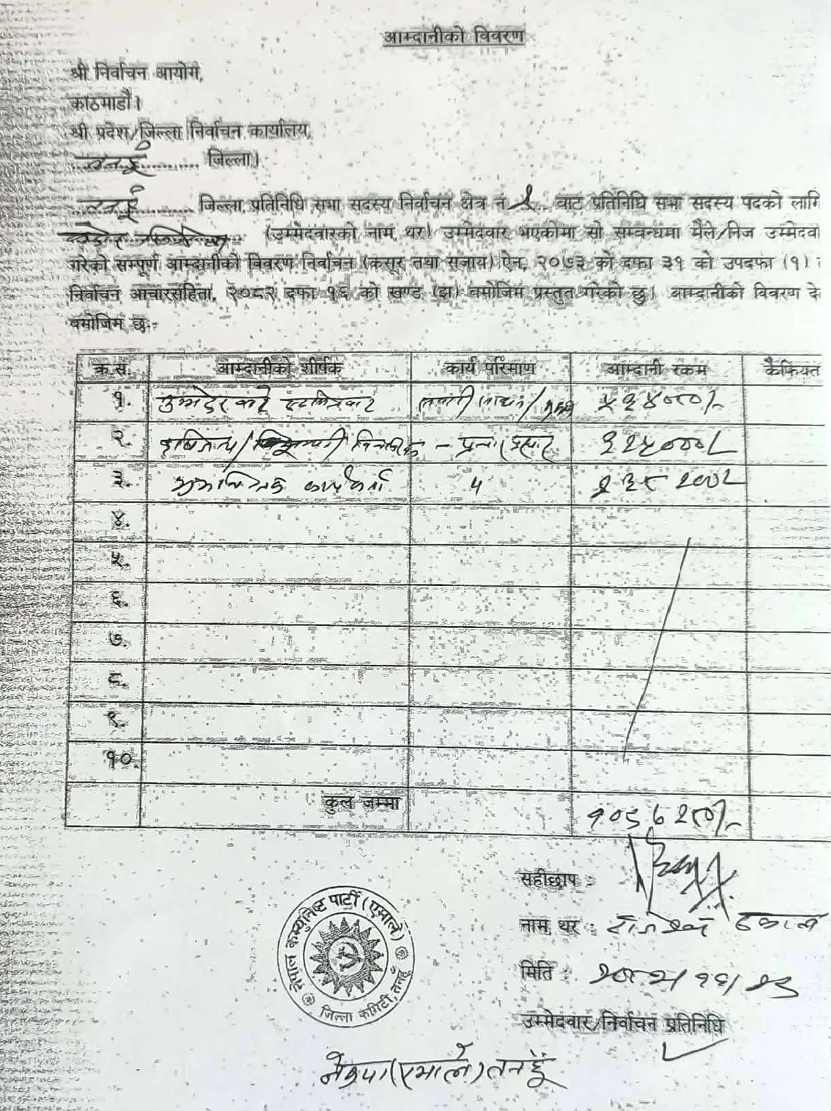 यस्तै सिग्देलले निर्वाचनको लागि प्राप्त भएको आम्दानी पनि निर्वाचन कार्यालयमा बुझाएका छन् । उनका अनुसार इष्टमित्रहरुबाट प्राप्त ५ लाख ३४ हजार ८०, कृषिजन्य बस्तु विक्रीबापत प्राप्त भएको ३ लाख २५ हजार र शुभचिन्तक तथा कार्यकर्ताहरुबाट प्राप्त भएको रकम २ लाख ३८ हजार २ सय रुपैयाँ गरि कुल १० लाख ९७ हजार २८० रुपैयाँ आम्दानी भएको छ ।