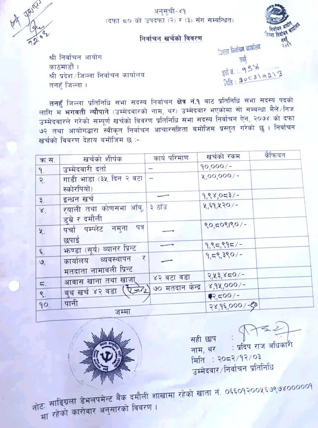 नेकपा एमाले तनहुँ क्षेत्र नम्बर १ की उम्मेदवार भगवती न्यौपानेले आफ्नो चुनावी खर्च सार्वजानिक गरेकी छिन् । न्यौपानेका प्रतिनिधिले मंगलबार जिल्ला निर्वाचन कार्यालय तनहुँमा चुनावी खर्च बुझाई सामाजिक सन्जाल मार्फत सार्वजानिक पनि गरेका छन् ।