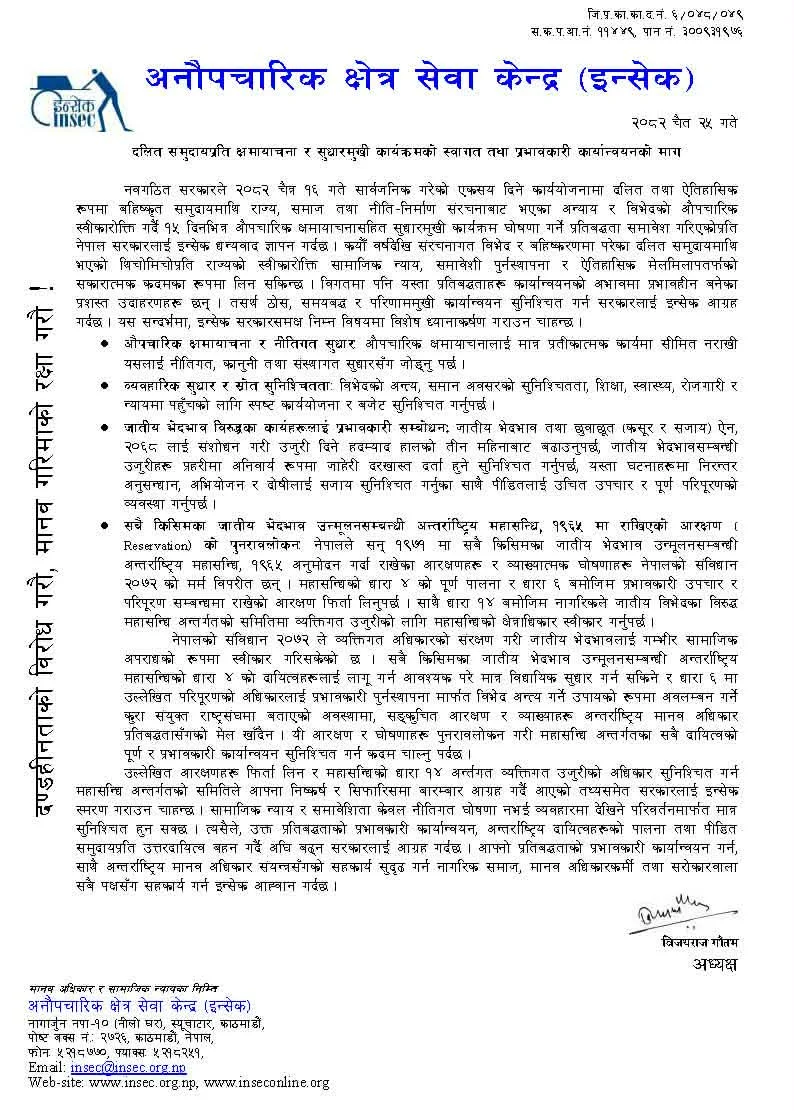 नवगठित सरकारले २०८२ चैत १६ गते सार्वजनिक गरेको एकसय दिने कार्ययोजनामा दलित तथा ऐतिहासिक रूपमा बहिष्कृत समुदायमाथि राज्य, समाज तथा नीति–निर्माण संरचनाबाट भएका अन्याय र विभेदविरुद्ध क्षमायाचनासहित सुधारमुखी कार्यक्रम घोषणा गर्ने प्रतिबद्धता समावेश गरेकोमा इन्सेकले नेपाल सरकारलाई धन्यवाद ज्ञापन तथा सो प्रतिबद्धताको स्वागत गरेको छ ।