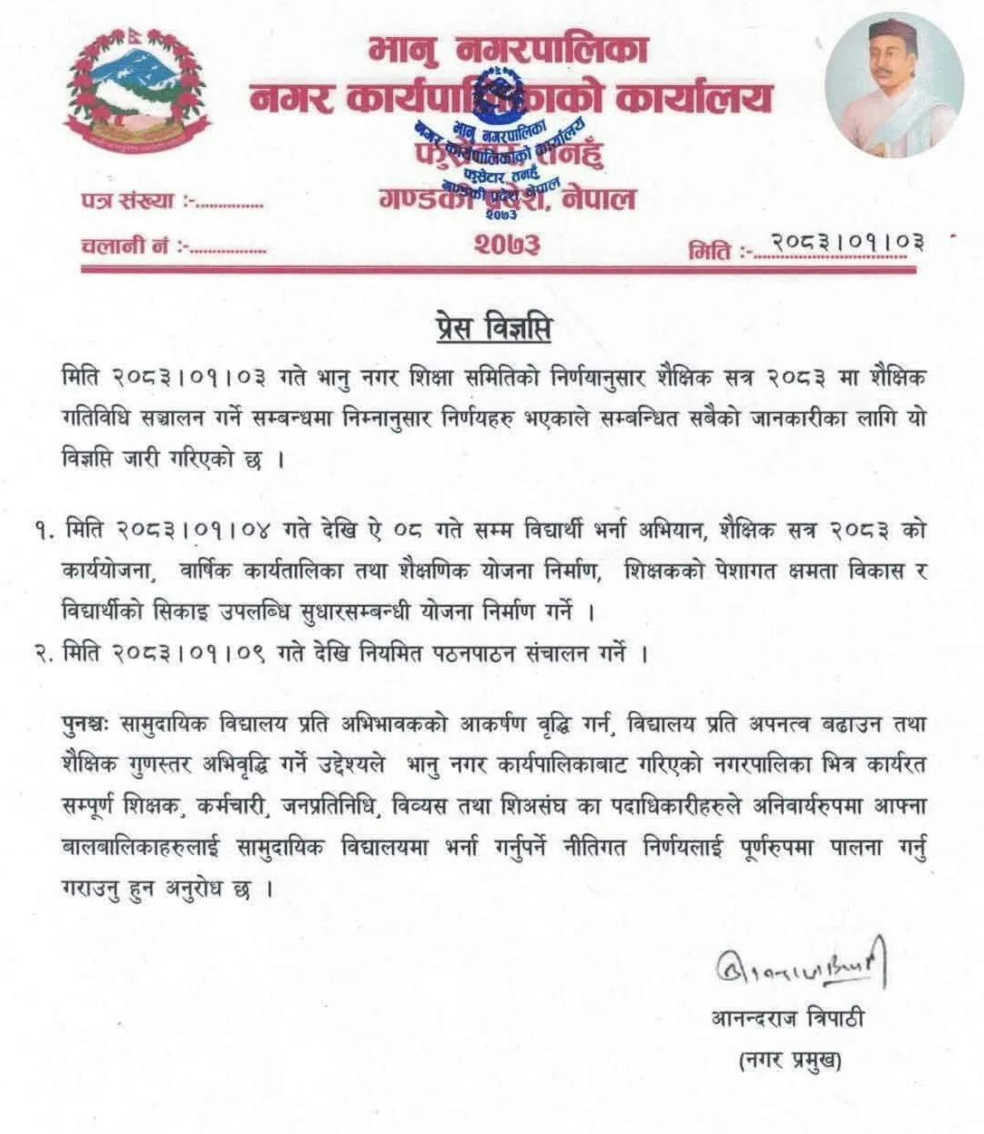 सामुदायिक विद्यालय प्रति अभिभावकको आकर्षण वृद्धि गर्न, विद्यालय प्रति अपनत्व बढाउन तथा शैक्षिक गुणस्तर अभिवृद्धि गर्ने उद्देश्यले भानु नगर कार्यपालिकाबाट गरिएको नगरपालिका भित्र कार्यरत सम्पूर्ण शिक्षक, कर्मचारी, जनप्रतिनिधि, विव्यस तथा शिअसंघका पदाधिकारीहरुले अनिवार्यरुपमा आफ्ना बालबालिकाहरुलाई सामुदायिक विद्यालयमा भर्ना गर्नुपर्ने नीतिगत निर्णयलाई पूर्णरुपमा पालना गर्नु गराउनु नगरप्रमुख आनन्दराज त्रिपाठीले अनुरोध गरेका छन् ।