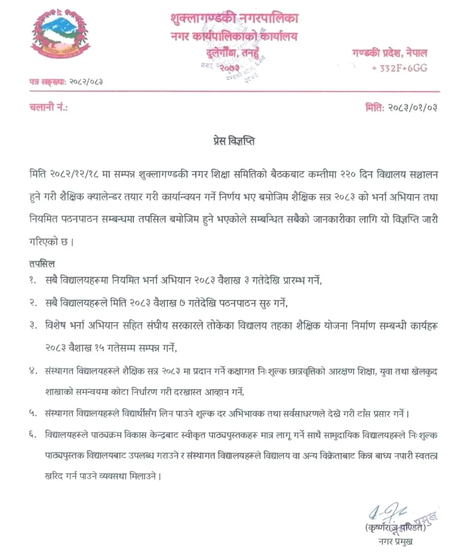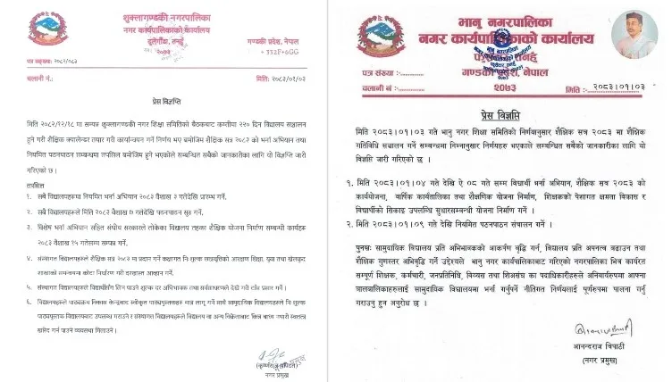 यसैविच तनहुँको शुक्लागण्डकी नगरपालिकाले बैशाख ७ गतेबाट र भानु नगरपालिकाले बैशाख ९ गतेबाट पठनपाठन सुरु गर्ने भएका छन् । चैत १८ गते सम्पन्न शुक्लागण्डकी नगर शिक्षा समितिको बैठकबाट कम्तीमा २२० दिन विद्यालय सञ्चालन हुने गरी शैक्षिक क्यालेन्डर तयार गरी कार्यान्वयन गर्ने निर्णय भए बमोजिम सबै विद्यालयहरूमा नियमित भर्ना अभियान २०८३ वैशाख ३ गतेदेखि प्रारम्भ गर्ने र सबै विद्यालयहरूले मिति २०८३ वैशाख ७ गतेदेखि पठनपाठन सुरु गर्ने शुक्लागण्डकी नगरपालिकाले निर्णय गरेको छ ।