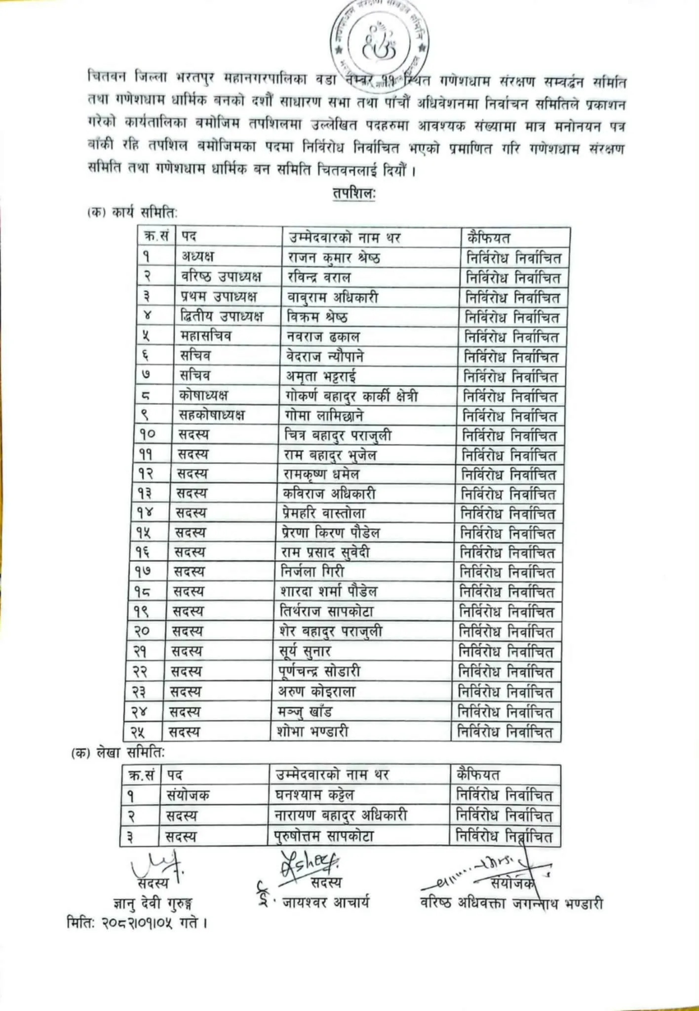 चितवनको भरतपुर महानगर–११ मा रहेको गणेशधाम धार्मिक वन तथा गणेशधाम संरक्षण सम्बद्र्धन समितिको दशौं वार्षिक साधारणसभा तथा अधिवेशनबाट नयाँ समिति चयन भएको छ ।