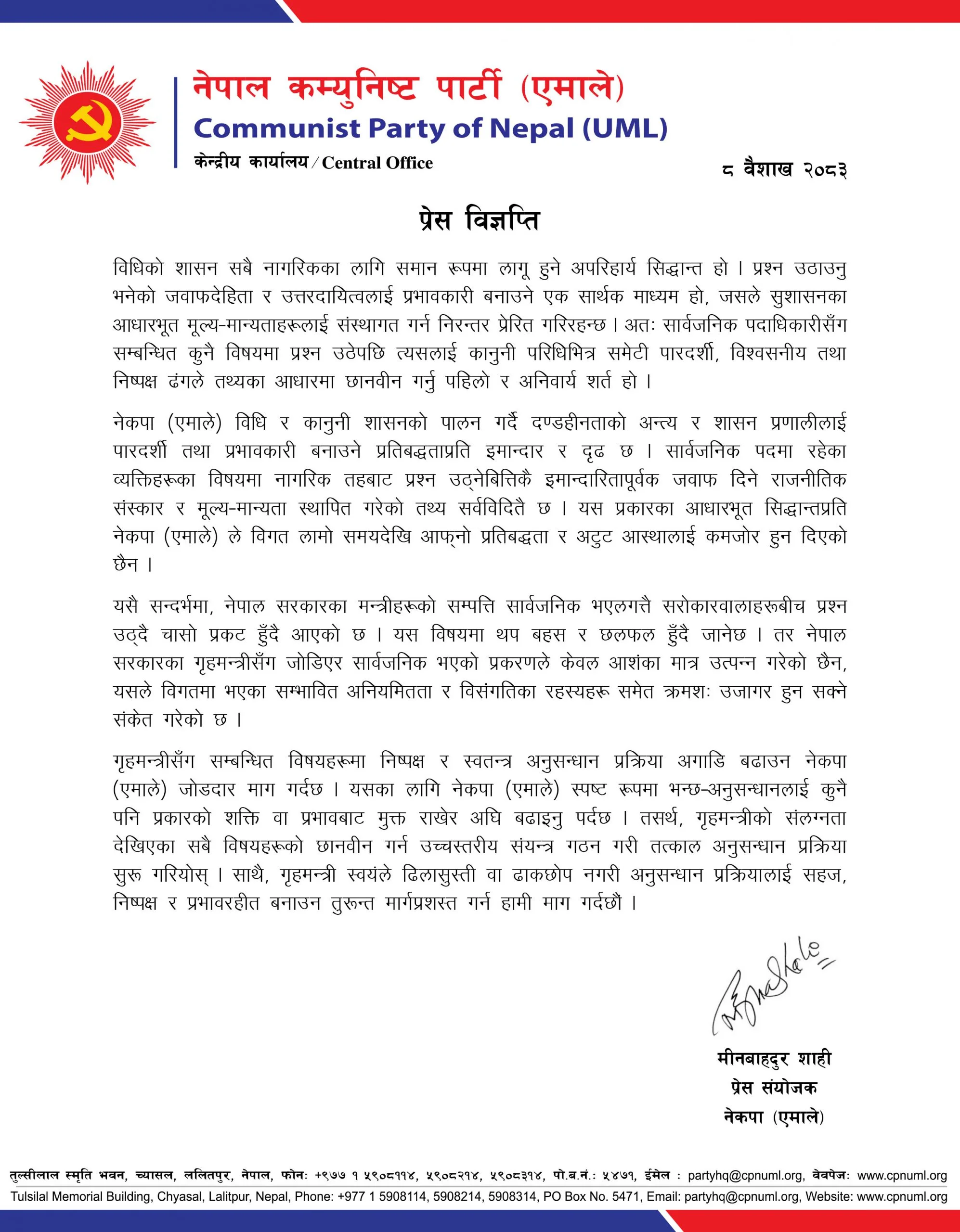 नेकपा एमालेले गृहमन्त्री सुधन गुरुङ जोडिएका विषयहरूमा निष्पक्ष र स्वतन्त्र अनुसन्धान प्रक्रिया अगाडि बढाउन माग गरेको छ । प्रेस संयोजक मीनबहादुर शाहीले विज्ञप्ति जारी गर्दै अनुसन्धानलाई कुनै पनि प्रकारको शक्ति वा प्रभावबाट मुक्त राखेर अघि बढाउनुपर्ने बताएका छन् ।