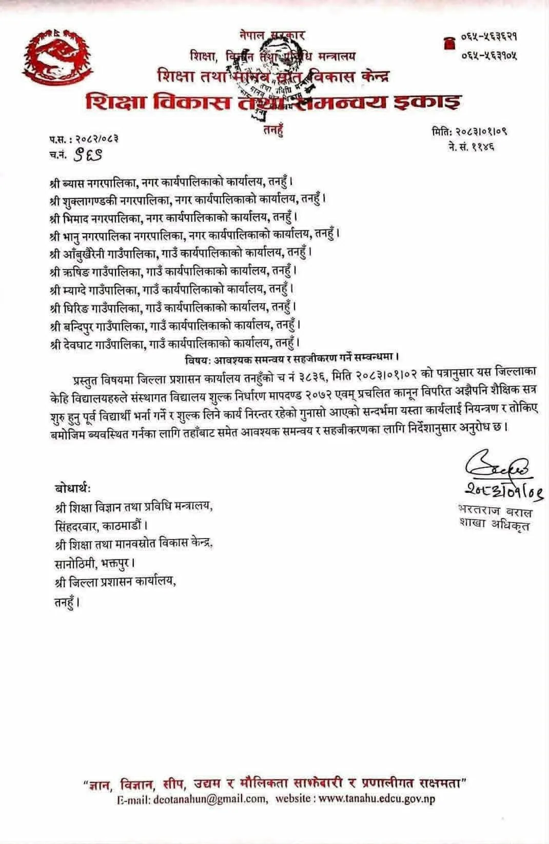शिक्षा विकास तथा समन्वय इकाइ तनहुँका प्रमुख भरतराज बरालले जिल्लाका दश वटै स्थानीय तहलाई पत्र पठाई शैक्षिक सत्र सुरु हुनुपुर्व विद्यार्थी भर्ना गर्ने र शुल्क लिने संस्थागत विद्यालयहरुको कार्य निन्त्रण गर्न र तोकिए बमोजिम व्यवस्थित गर्नको लागि सहजिकरण गर्न अनुरोध गरेका छन् ।
