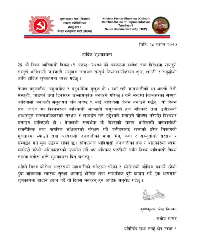 शुभकामना सन्देशमा सांसद श्रेष्ठले नेपाल बहुजातीय, बहुभाषीय र बहुधार्मिक मुलुक हो । यहाँ सबै जातजातीको आ–आफ्नो रिती संस्कृती, चाडपर्व तथा दिवसहरु उल्लासपुर्वक मनाउने गरिन्छ । यसै सन्र्दमा विश्वभरका सम्पुर्ण आदिवासी जनजाती समुदायले पनि अगष्ट ९ लाई आदिवासी दिवस मनाउने गरेको जनाएका छन् । यो दिवस सन १९९४ मा विश्वभरका आदिवासी जनजाती समुदायको हक अधिकार तथा उनीहरुको आधारभुत मानवअधिकारको संरक्षण र सम्बद्र्धन गर्ने उद्देश्यले मनाउने घोषणा गरेपछि विश्वभर मनाउन थालिएको उल्लेख गरेका छन् ।
