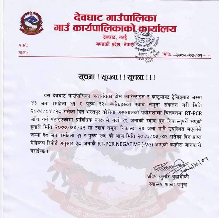 देवघाट गाउँपालिकामा स्वाब संकलन गरि पिसिआर परिक्ष्ण गरेका सबैको रिर्पाेट नेगेटिभ आएको छ । गाउँपालिकाका स्वास्थ्य शाखाका प्रमुख प्रदिपकुमार बुढाथोकीका अनुसार पिसिआर परिक्षण गरेका सबै ३८ जनाको रिर्पाेट नेगेटिभ आएको हो ।