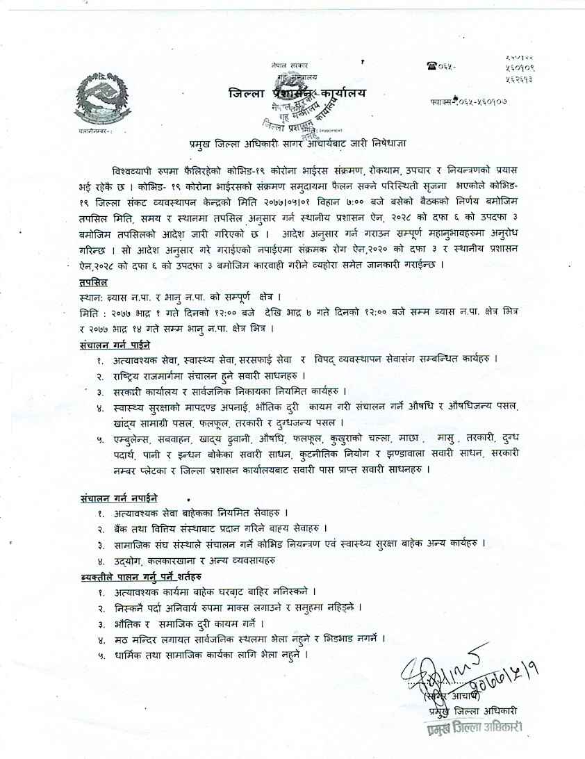 प्रशासनले व्यास नपामा सोमबार दिउँसो १२ बजेदेखि भदौ ७ गते दिउँसो १२ बजेसम्म र भानु नपामा भदौ १४ गते सम्म निशेधाज्ञा लागु गरेको हो । यो अवधिमा अत्यावश्क सेवा बाहेकका अन्य कुनै पनि सेवाहरु गर्न पाईने छैन । बैंक तथा वित्तिय संस्थाका कुनै पनि सेवाहरु पुर्णरुपमा बन्द गरिने छ । त्यस्तै उद्योग कलकारखाना तथा अन्य कुनै पनि सेवाहरु बन्द गर्नु पर्ने जिल्ला प्रशासन कार्यालयले जारी गरेको सुचनामा उल्लेख छ ।
