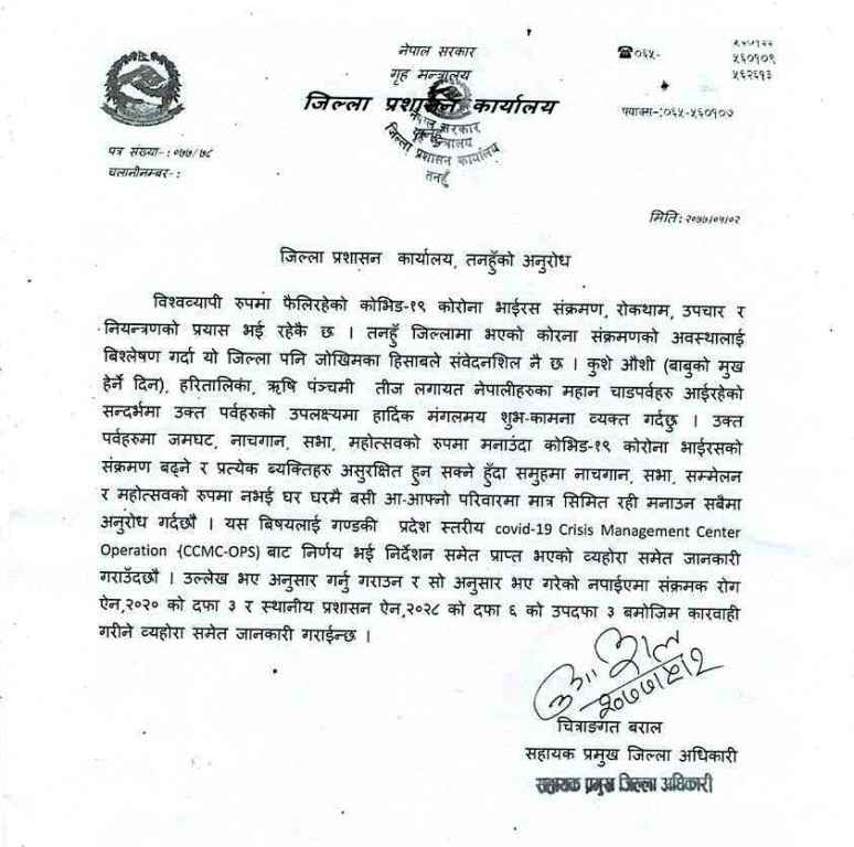कुशे औंशी, हरितालिका, ऋषि पञ्चमी, तीज लगायतका नेपालीहरुका महान् चाडपर्व आइरहेको सन्दर्भमा उक्त पर्वहरुमा जमघट, नाचगान, सभा गर्दा कोभिड–१९ को सङ्क्रमण बढ्न सक्ने भएकाले आ–आफ्नो परिवारमा मात्र सीमित रही मनाउन अनुरोध गरिएको सहायक प्रमुख जिल्ला अधिकारी चित्राङ्गत बरालले बताए ।