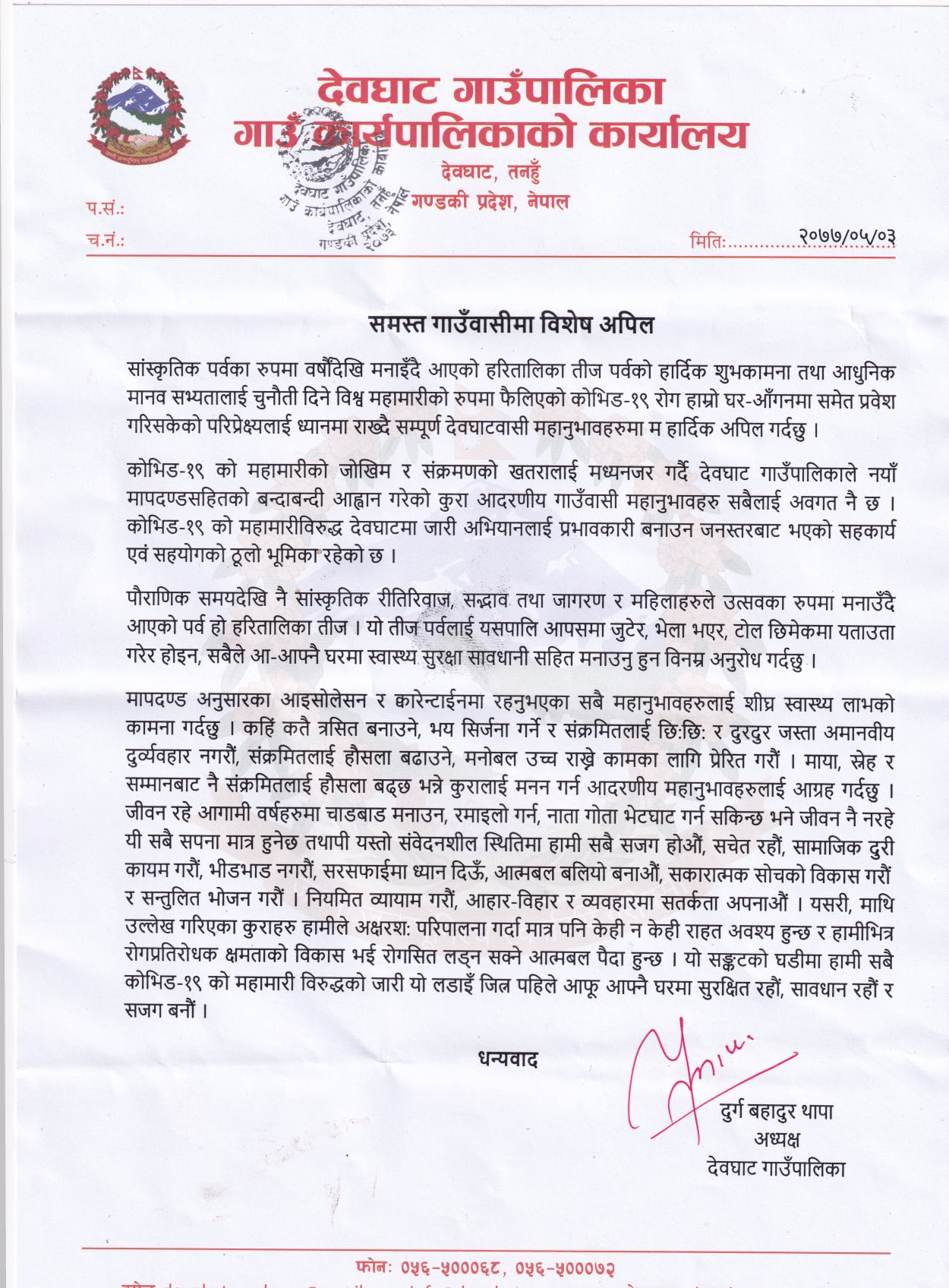 देवघाट गाउँपालिकाका अध्यक्ष दुर्गबहादुर थापाले सुरक्षित रहेर, घरमै बसेर चाडबाड मनाउन गाउँपालिकाबासीलाई अपिल गरेका छन् । बुधबार विशेष अपिल प्रकाशित गरि अध्यक्ष थापाले आधुनिक मानव सभ्यतालाई नै चुनौती दिने गरि कोभिड १९ (कोरोना भाईरस) हाम्रो घर आँगनमै आईसकेको हुँदा सबै गाउँपालिकाबासी सुरक्षित भएर बस्न अपिल गरेका छन् ।