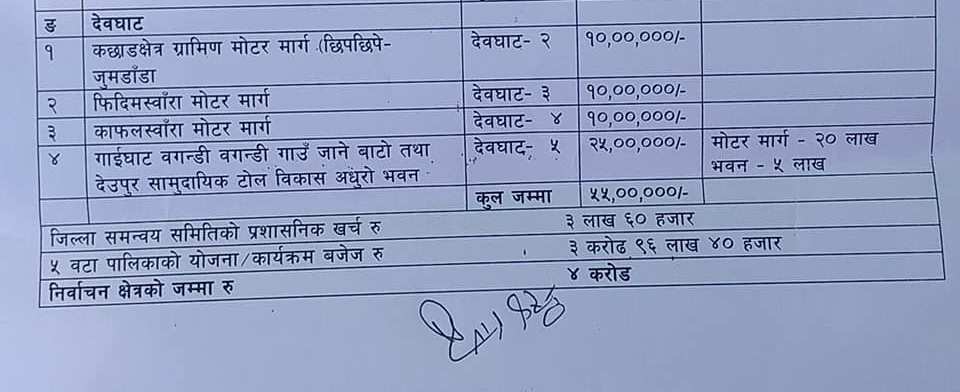 वडा नम्बर ५ को गाईघाट देखी बगन्दी सम्म जाने मोटरमार्ग खन्न २० लाख र देउपुर टोल विकास संस्थाको सामुदायीक भवनको अधुरो कामकोलागि ५ लाख रुपैयाँ विनियोजन गरेका छन् ।