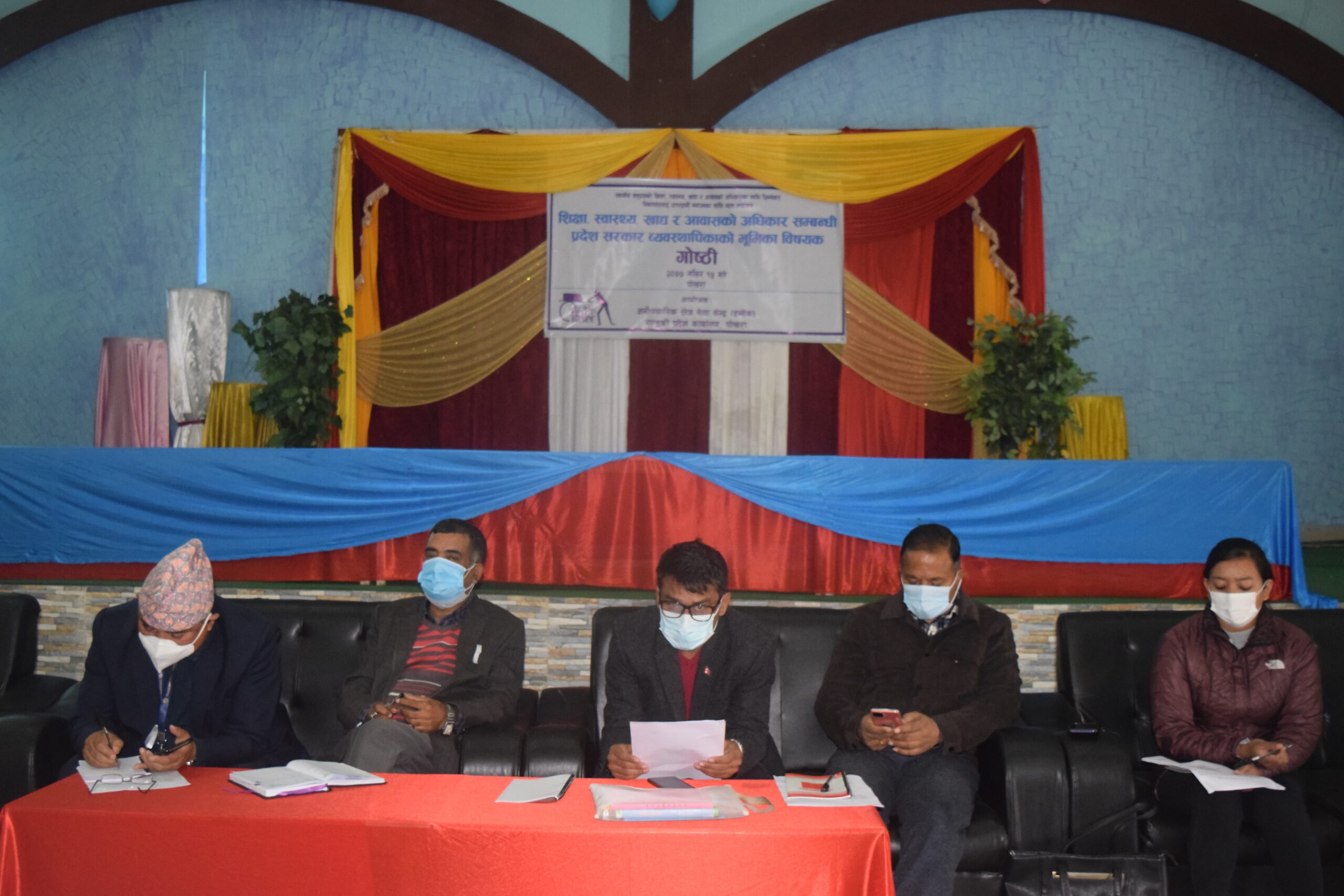 राष्ट्रिय मानव अधिकार आयोग अधिकृत सरु श्रेष्ठले हतारमा कानुन आउने तर कार्यान्वयको पाटो फितालो देखिएकाले नागरिक समाजले खबरदारीका लागि प्रभावकारी भूमिका निर्वाह गर्नुपर्ने बताईन् । कार्यक्रममा शिक्षा स्वास्थ्य, खाद्य र आवासको अधिकारमा प्रदेश सरकारको भूमिका बारे कार्यपत्र प्रस्तुत गर्दै अधिवक्ता कमल आर्यालले व्यवस्था भन्दा पनि अवस्थाको बारेमा छलफल चलाउन आवश्यक देखिएको धारणा राखे ।