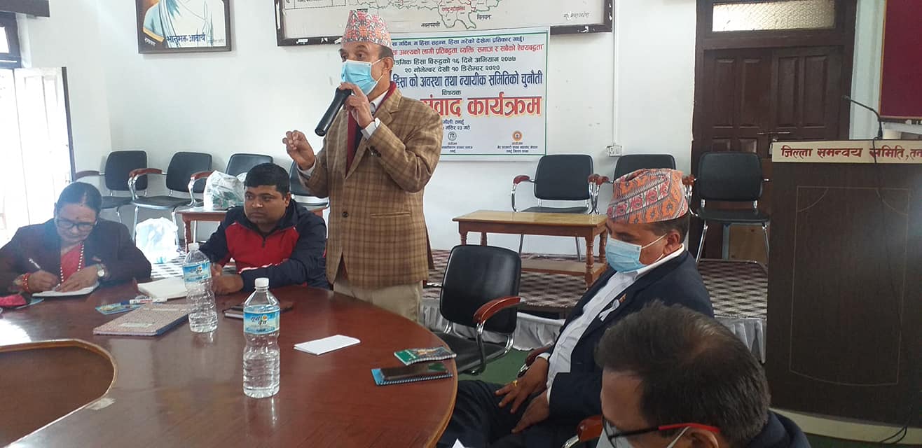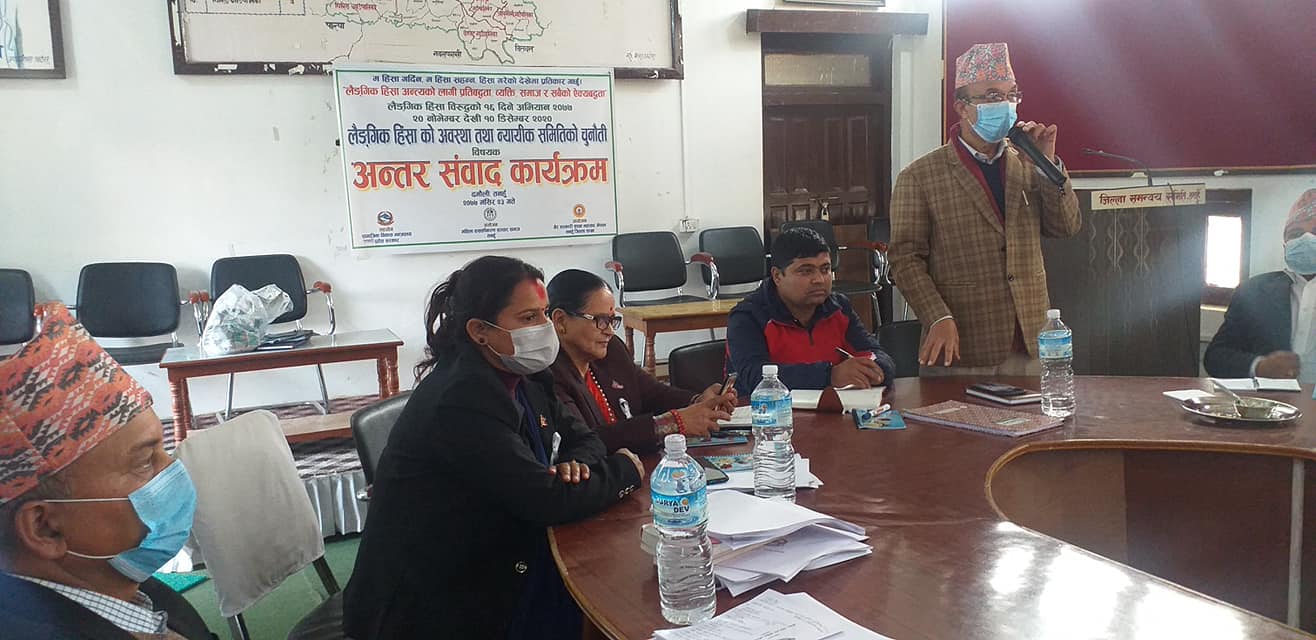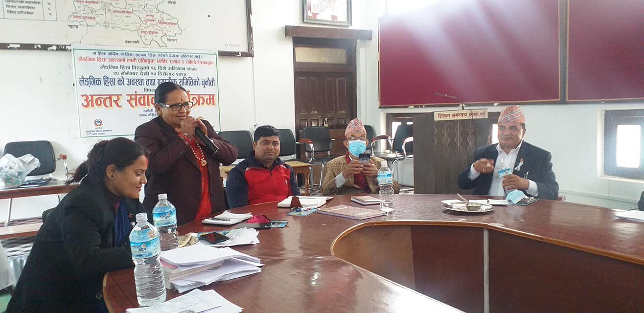 प्रमुख जिल्ला अधिकारी सागर आचार्यले लैङ्गिक हिंसाको अन्त्य गर्न स्थानीय तहको सबैभन्दा ठुलो भुमिका हुने बताए । अहिले कतिपय विषयमा स्थानीय प्रशासनको अधिकार स्थानीय तहमा पुगेको हुँदा स्थानीय तहले जनतालाई सहज हुने तरिकाले कानुन निर्माण गरि हिंसा लगायतका सबै कुरितीहरुको अन्त्य गर्न भुमिका खेल्नु पर्ने प्रजिअ आचार्यले बताए ।