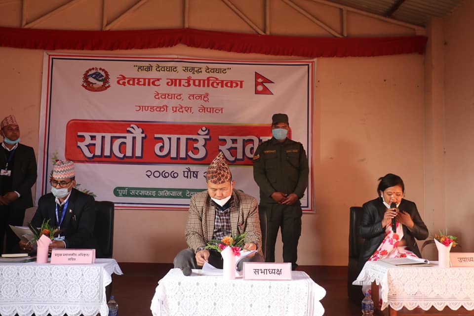 देवघाट गाउँपालिकाको सातौं गाउँ सभा आईतबार सम्पन्न भयो । गाउँपालिकाका अध्यक्ष दुर्गबहादुर थापाको अध्यक्षतामा सम्पन्न सो सभामा बोल्दै अध्यक्ष थापाले देवघाटलाई समृद्ध बनाउन गाउँपालिकाले निर्धारण गरेको नीति तथा कार्यक्रमको सफल कार्यान्वयन हुनु पर्ने बताए ।