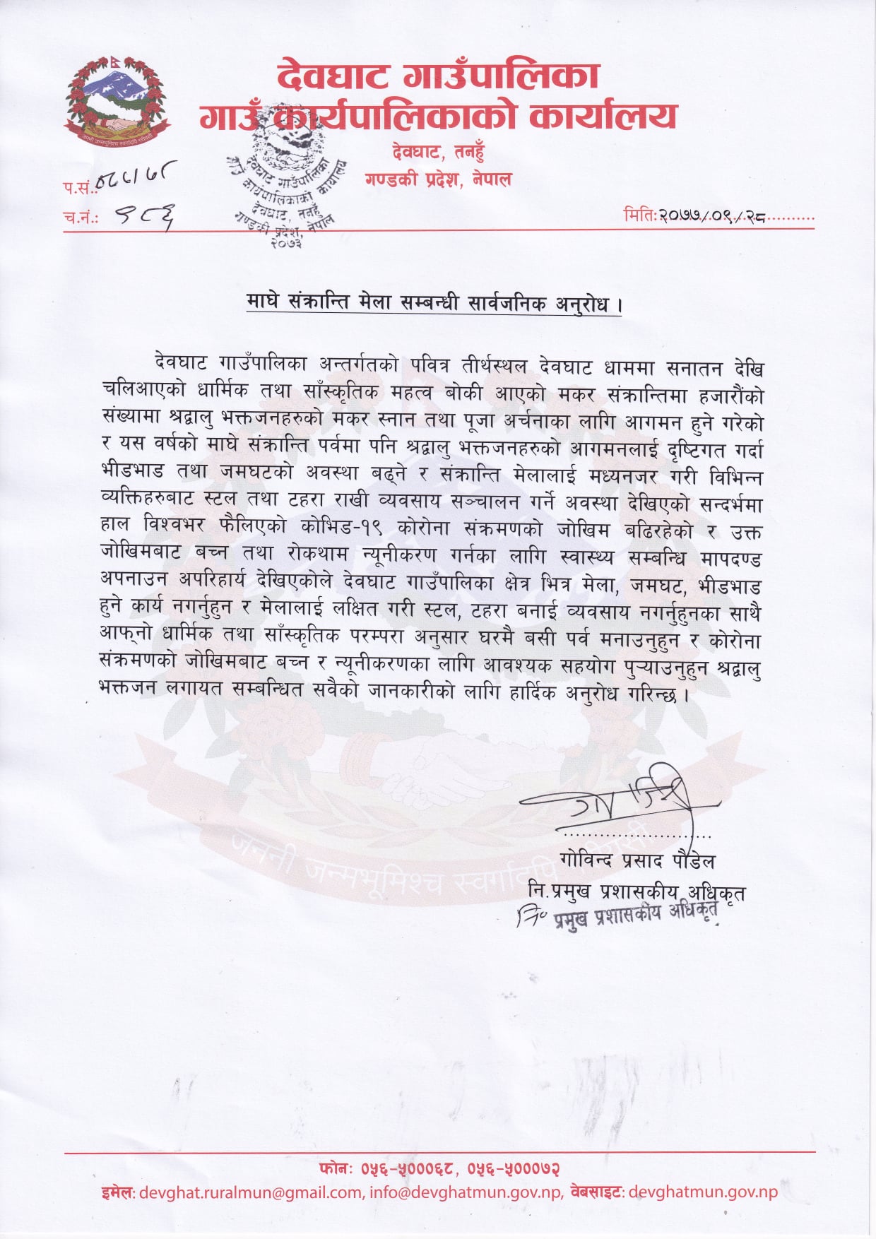 मकर सक्रान्ती मेलालाई लक्षित गरि व्यक्तिहरुको भिडभाड बढ्न सक्ने अवस्थालाई दृष्टिगत गरि टहरा तथा स्टल राखी व्यापार व्यवसाय सन्चालन गर्ने अवस्था देखिएकोहुँदा यस वर्ष कोभिड–१९ को जोखिमबाट बच्न मेलामा भिडभाड नगर्न तथा भिडभाड बढ्ने खालको व्यवसायजन्य क्रियाकलाप नगर्न देवघाट गाउँपालिकाले सर्वसाधरणलाई अनुरोध गरेको छ ।