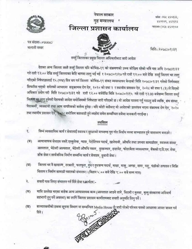 नेपाल सरकार संघीय मन्त्रीपरिषदको बैशाख ६ गतेको निर्णय र जिल्ला कोभिड –१९ संकट व्यवस्थापन केन्द्रको बैशाख २१ गतेको निर्णय अनुसार संक्रामक रोग ऐन, २०२० को दफा २, स्थानीय प्रशासन ऐन, २०२८ को दफा ६ (३) ले दिएको अधिकार प्रयोग गरि जिल्लाभर निषेधाज्ञा जारी गरिएको प्रमुख जिल्ला अधिकारीद्वारा जारी गरिएको सुचनामा उल्लेख छ ।