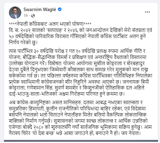 स्वर्णिम वाग्लेले नेपाली कांग्रेसबाट अलग भएको घोषणा गरेका छन् । बिहीबार उनले सामाजिक सञ्जाल फेसबुकमा एक लेख लेख्दै काँग्रेसबाट अलग भएको घोषणा गरेका हुन् ।