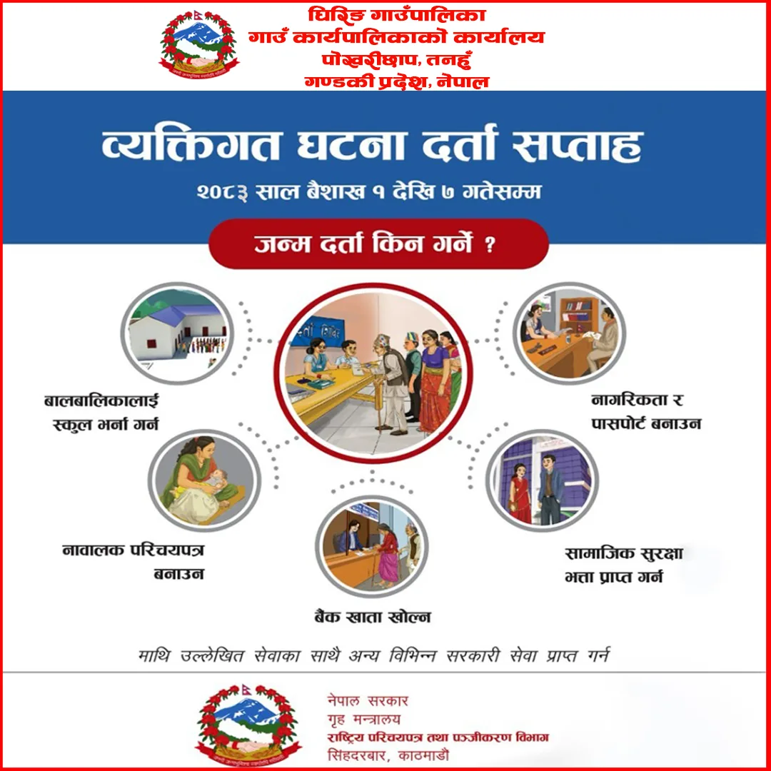 तनहुँ । चैत ३० देशै भरका स्थानीय तहमा बैशाख १ गते मंगलबारदेखी देशैभर व्यक्तिगत घटना दर्ता सप्ताह सुरु भएको छ